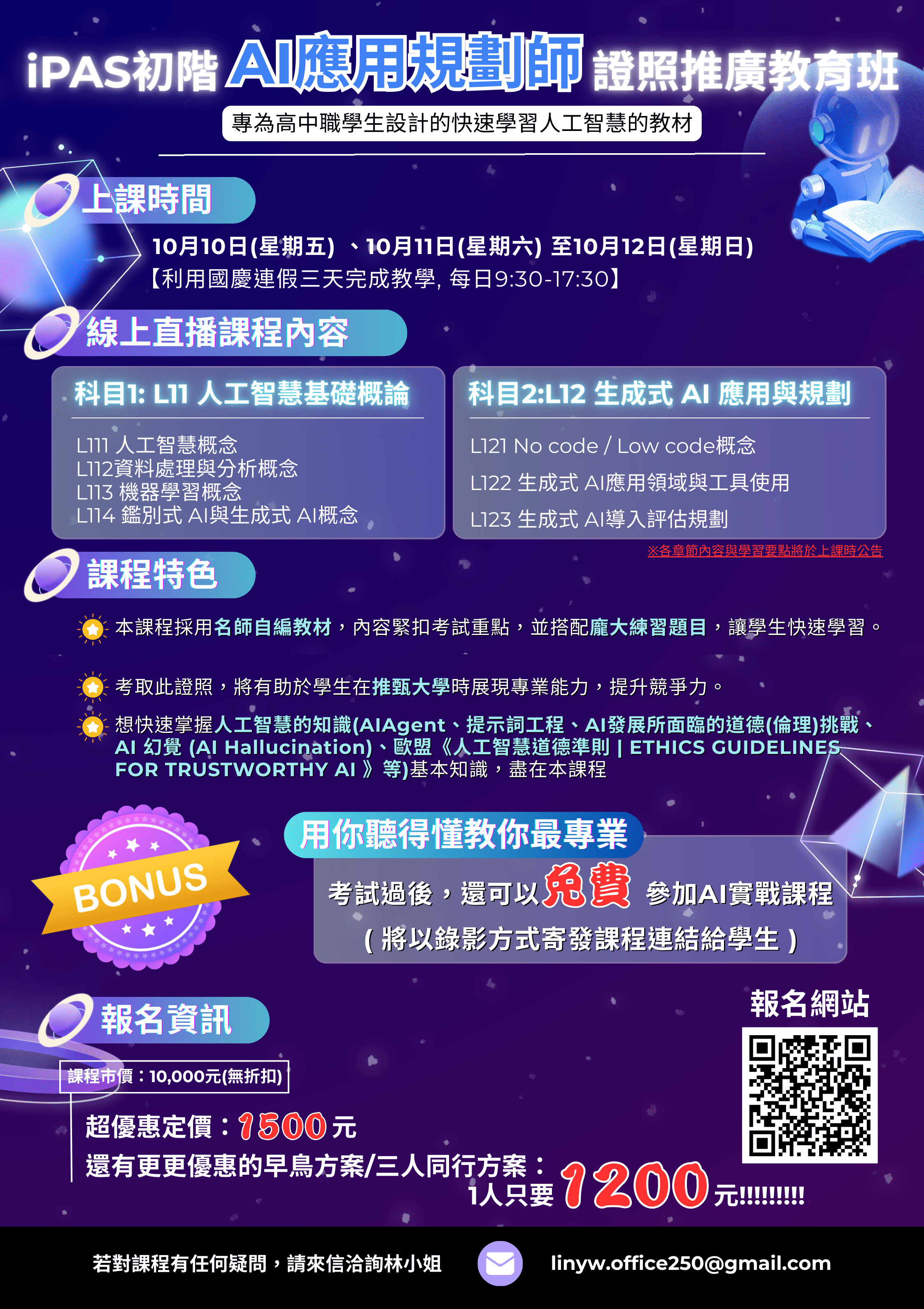 一、為因應國內人工智慧人才需求,本校資訊工程系特開設「iPAS AI應用規劃師 (初階)證照班」,協助學生打好人工智慧基礎知識,並取得國家推動之人工智慧證照,課程詳情如下: