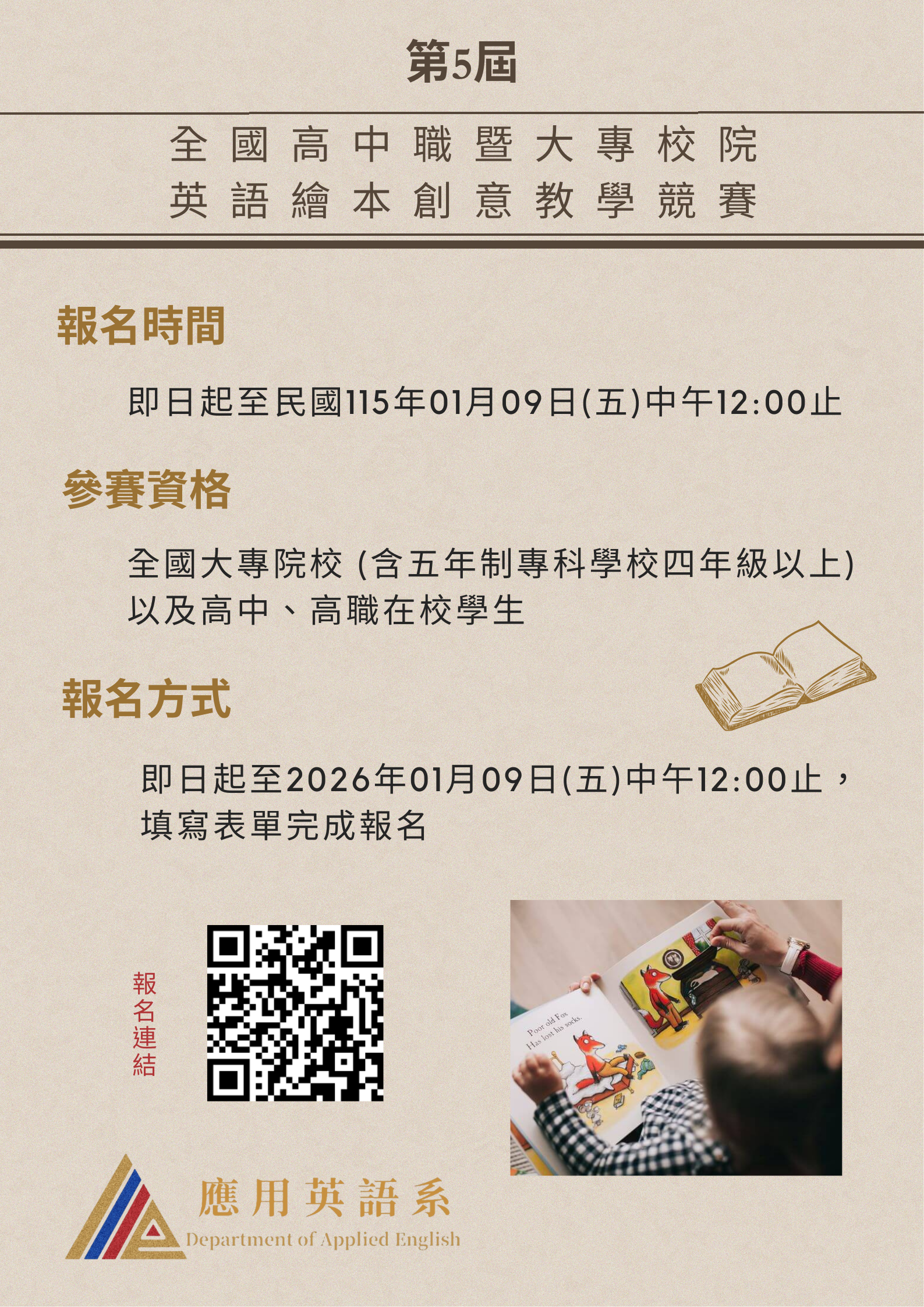 | 公告主旨 | 檢送朝陽科技大學應用英語系辦理「第5屆全國高中職暨大專校院英語繪本創意教學競賽」辦法 |