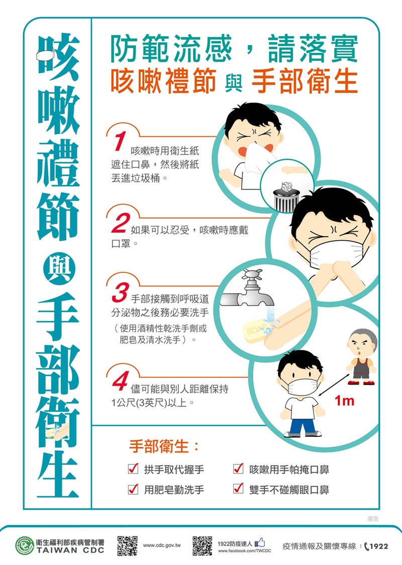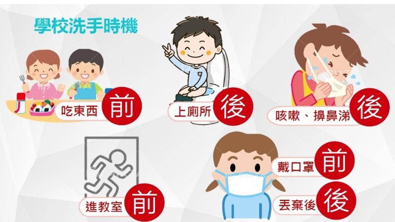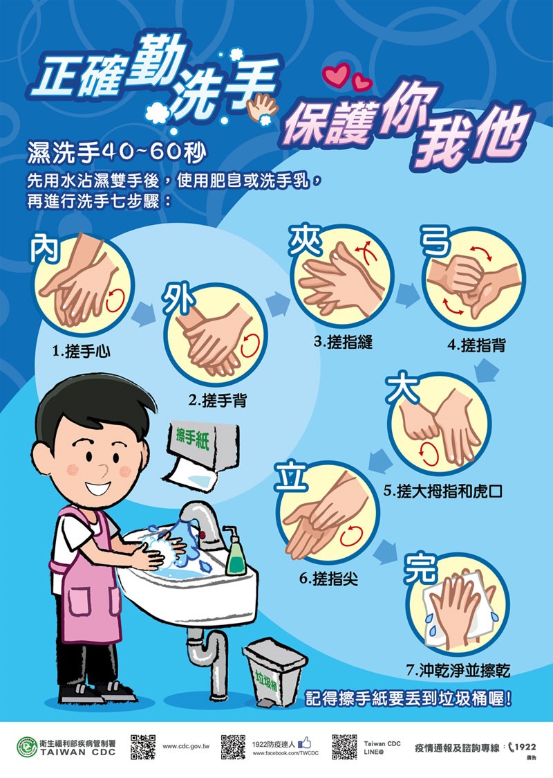 - 手部衛生:接觸公共物品後、進食前、須用正確洗手七字訣(內外夾弓大立腕) 以肥皂洗手至少20秒,尤其咳嗽或打噴嚏後更應立即洗手。