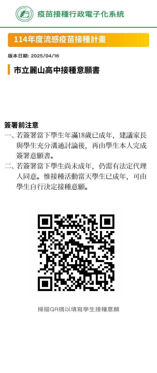 | 公告內容 | 校園流感疫苗電子化系統(NIAS) 線上簽署 操作指引 親愛的學生、家長、老師、同仁,您好 本年公費流感疫苗將於10月1日開打,全面採用三價疫苗,本校配合本縣/市衛生局合約醫療團隊 焉醫師診所 預計於114年 10月 16日 (星期四) 為進行流感疫苗接種服務,特此通知並徵求您的同意。 因應E化及減紙政策,本縣/市與衛生福利部疾病管制署合作推行疫苗接種行政電子化系統(NIAS),改以提供簽署網頁連結網址及QR code的方式,導引您進入NIAS系統進行線上意願簽署,只需要用手機掃描QR code或點選QR code下方連結,即可於線上完成簽署作業,簽署截止期限為114年10月13日 (星期一) 中午前,於截止期限前,您都能透過上述方式登入簽署網頁修改接種意願。 點選以下連結: