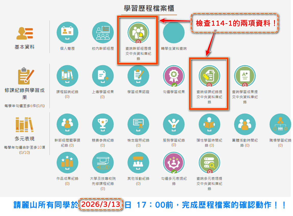 校園公告 公告主旨 【歷程檔案】請麗山所有同學於115/03/13日(五) 17:00前,完成歷程檔案的確認動作!! 發佈日期 2026 年 3 月 02 日 發佈單位 註冊組 公告類別 最新消息, 學生園地, 學生學習歷程檔案 公告等級 重要 點閱次數 1,180 公告內容 高一高二高三同學需要確認的資料如下: 1.1141修課記錄 2.1141校內幹部經歷 ================================== 收訖明細的操作說明如下 臺北市學生學習歷程檔案系統操作手冊(113.12.10) 臺北市學生學習歷程檔案系統操作手冊(113.12.10) 檔案名稱檔案大小檔案格式下載收訖明細操作手冊-學生部分(1131210).pdf768.26 KB新視窗開啟檔案 收訖明細操作手冊-學生部分(1131210).pdf (點擊下載檔案) 收訖明細操作手冊-學生部分(1131210) ========================================================== 注意事項: 『收訖明細之確認』是指台北市學生歷程檔案平台與教育部中央資料庫對接資料的確認,若為原上傳截止日前未上傳,或是因故未勾選者,不屬資料庫錯誤。 比對項目說明: 1.校內幹部資料:與提交資料是否相符。 2.修課紀錄資料:各學期修課科目及成績是否相符。 ➙➙➙學生比對提交與接受的資料是相符,若是原來資料有錯誤(如寫錯字、 傳錯檔案等),均不予處理。亦不得刪除或新增頂。 ➙➙➙上傳之附件檔案由系統自動比對.學生只須確認比對結果是否相符即可。 ➙➙➙依教育部國民及學前教育署112年8月15日臺教國署高字第1120106017號函示,學生超過收訖明細確認公告期間未確認,或未向學校提出疑義者,視為已確認學校提交資料與學生上傳資料一致,請同學務必留意於2026年03月13日(星期五)下午17:00前完成確認,以免影響未來自身升學權益。 ☀☀☀錯誤修正將依國教署相關公文辦理。☀☀☀ 相關附件 相關連結 臺北市學生學習歷程檔案系統 【2026-03-02】公告3月午餐菜單,請親師生知悉。 【2026-03-01】社團法人臺灣藍染學會舉辦「2026年國家公園自然人文生態觀察研習 ...