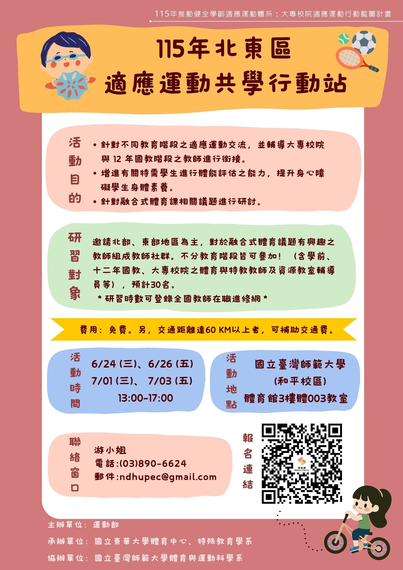 校園公告 公告主旨 北東區適應運動共學行動站 發佈日期 2026 年 4 月 28 日 發佈單位 特教組 公告類別 最新消息, 教師研習 公告等級 轉知 點閱次數 8 公告內容 115年推動健全學齡適應運動體系:大專校院適應運動行動藍圖計畫,詳見附件 相關附件 「北東區適應運動共學行動站」 「北東區適應運動共學行動站」 檔案名稱檔案大小檔案格式下載「北東區適應運動共學行動站」.jpg378.14 KB新視窗開啟檔案115年推動健全學齡適應運動體系.pdf452.62 KB新視窗開啟檔案 「北東區適應運動共學行動站」.jpg115年推動健全學齡適應運動體系.pdf 【2026-04-28】中國機械工程學會辦理「2026高中生前瞻科技探索—機械跨域創新論 ... 【2026-04-28】「AI編你入戲文學創作實驗室」推廣教育非學分班課程