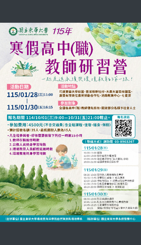 公告主旨 | 國立東華大學自然資源與環境學系擬於明年(115年)舉辦【115年寒假高中職教師研習營活動】 |