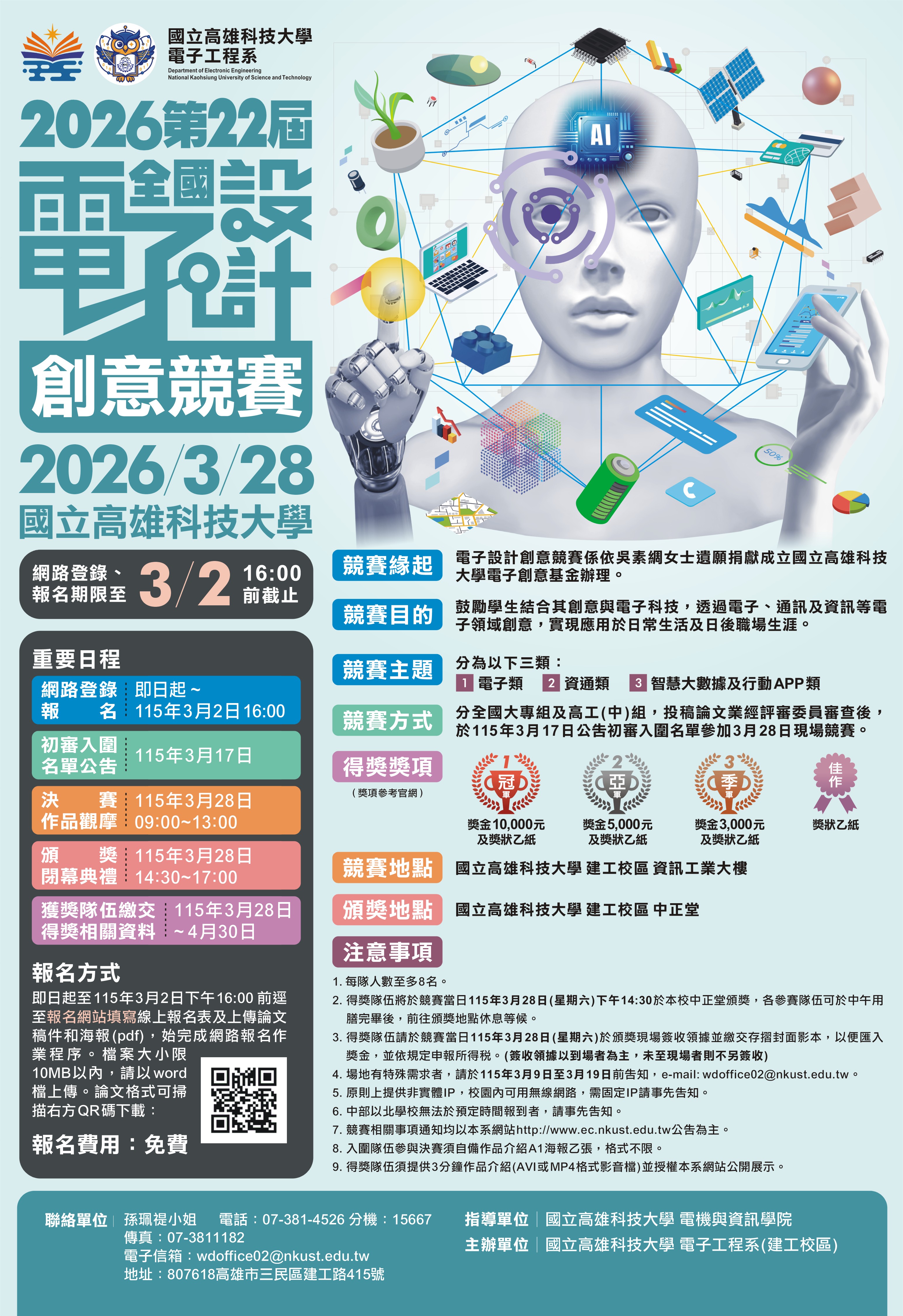 | 公告主旨 | 國立高雄科技大學舉辦「2026年第二十二屆全國電子設計創意競賽」 |