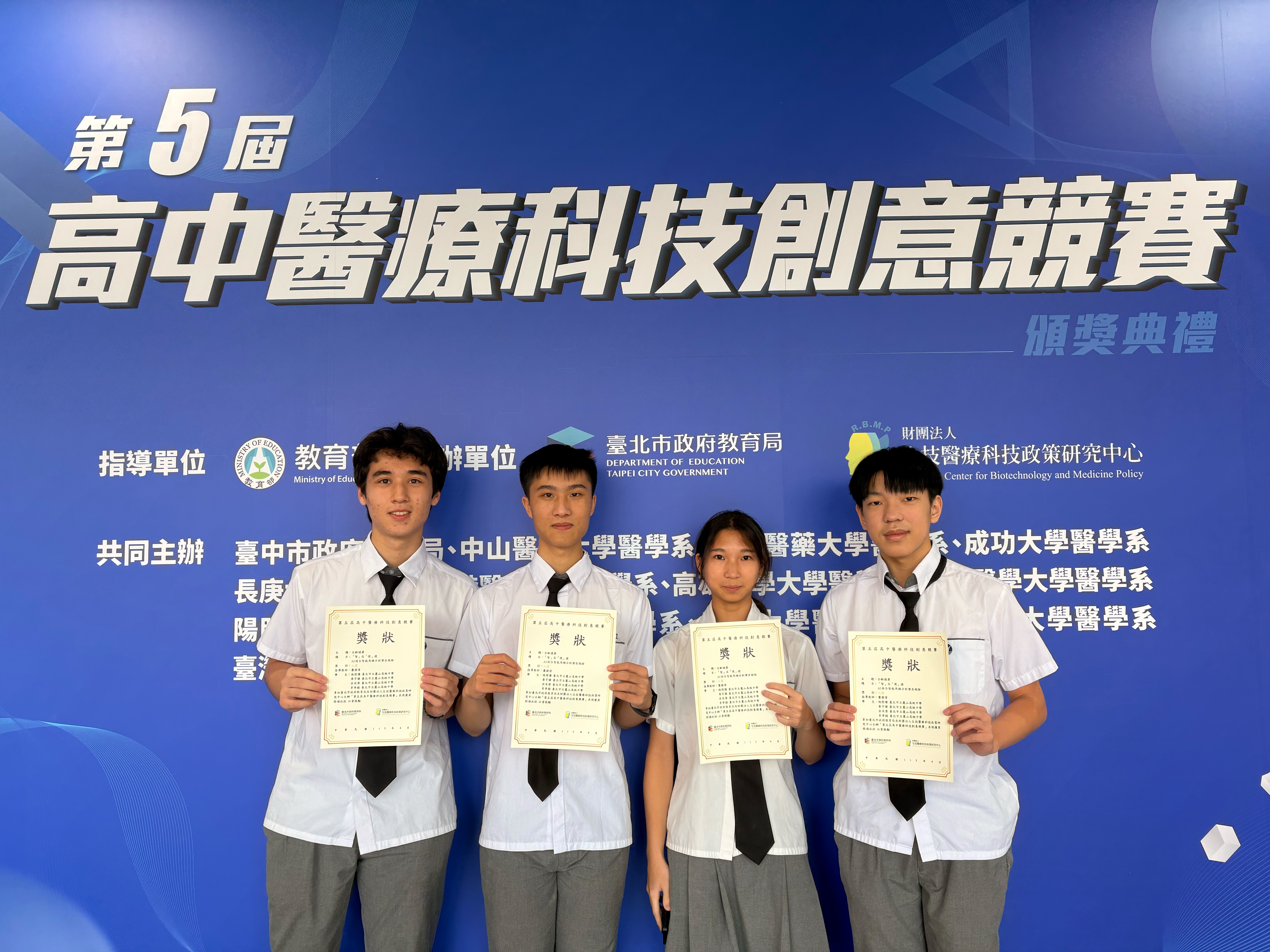 同時,在醫療科技領域,本校學生參加「第五屆高中醫療科技創意競賽」亦有卓越表現,本校榮獲特優學校獎殊榮,蕭國偉老師榮獲特優指導教師獎,指導多組學生團隊在競賽中表現優異,充分展現本校推動科學創新教育的深厚實力。學生團隊以創新思維結合人工智慧與醫療應用,成果豐碩,包括榮獲智慧醫療佳作之「Reskin AI-壓力衣:讓AI擁抱每一吋復原的皮膚」,以及多項入選作品,如「腦部生命徵象智慧夾層帽」、「經顱磁刺激磁性奈米粒子精準定位系統」、「AI結合智能馬桶分析潛在風險」、「被動式智慧情感撫慰機器鳥」、「異位性皮膚炎智慧袖套」、「無侵無痛精準測量系統」及「AI智能失智症照護手錶」等,展現學生對於健康照護與科技應用的關懷與創新能力。