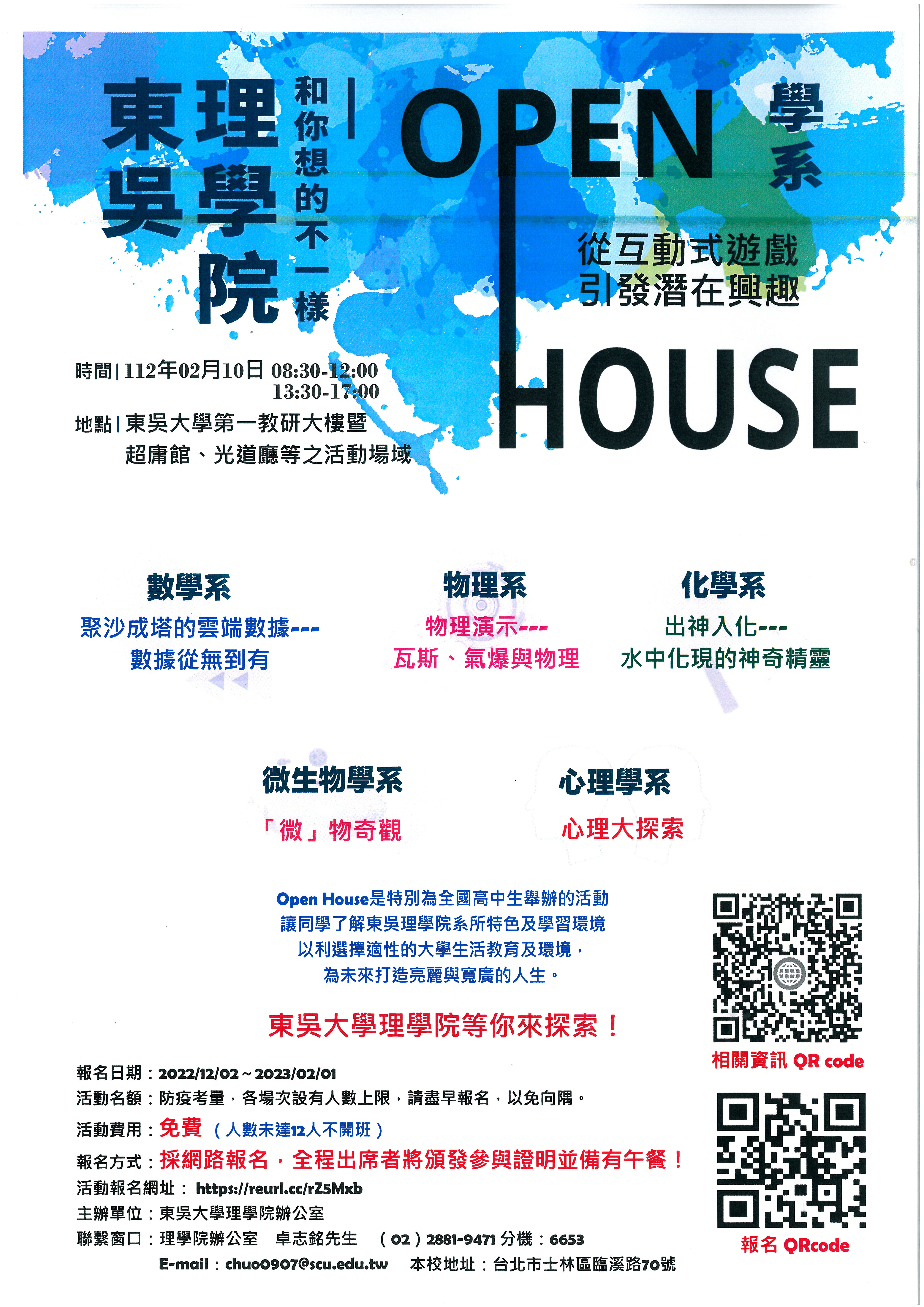 | 公告主旨 | 東吳大學於112年2月10日(星期五)舉辦「學系Open House」活動 |