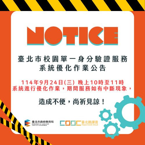 校園公告 公告主旨 臺北市校園單一身分驗證服務於9/24(三)晚上10時至11時進行優化作業,期間服務如有中斷現象,造成不便,尚祈見諒。 發佈日期 2025 年 9 月 23 日 發佈單位 資訊組 公告類別 最新消息, 學生園地 公告等級 急件 點閱次數 136 公告內容 臺北市校園單一身分驗證服務於9/24(三)晚上10時至11時進行優化作業,期間服務如有中斷現象,造成不便,尚祈見諒。 相關附件 【2025-09-23】「AI人工智慧輔助IA智能增強:課程篇」 【2025-09-22】文藻學校財團法人文藻外語大學東南亞學系與社團法人高雄市東南亞 ...