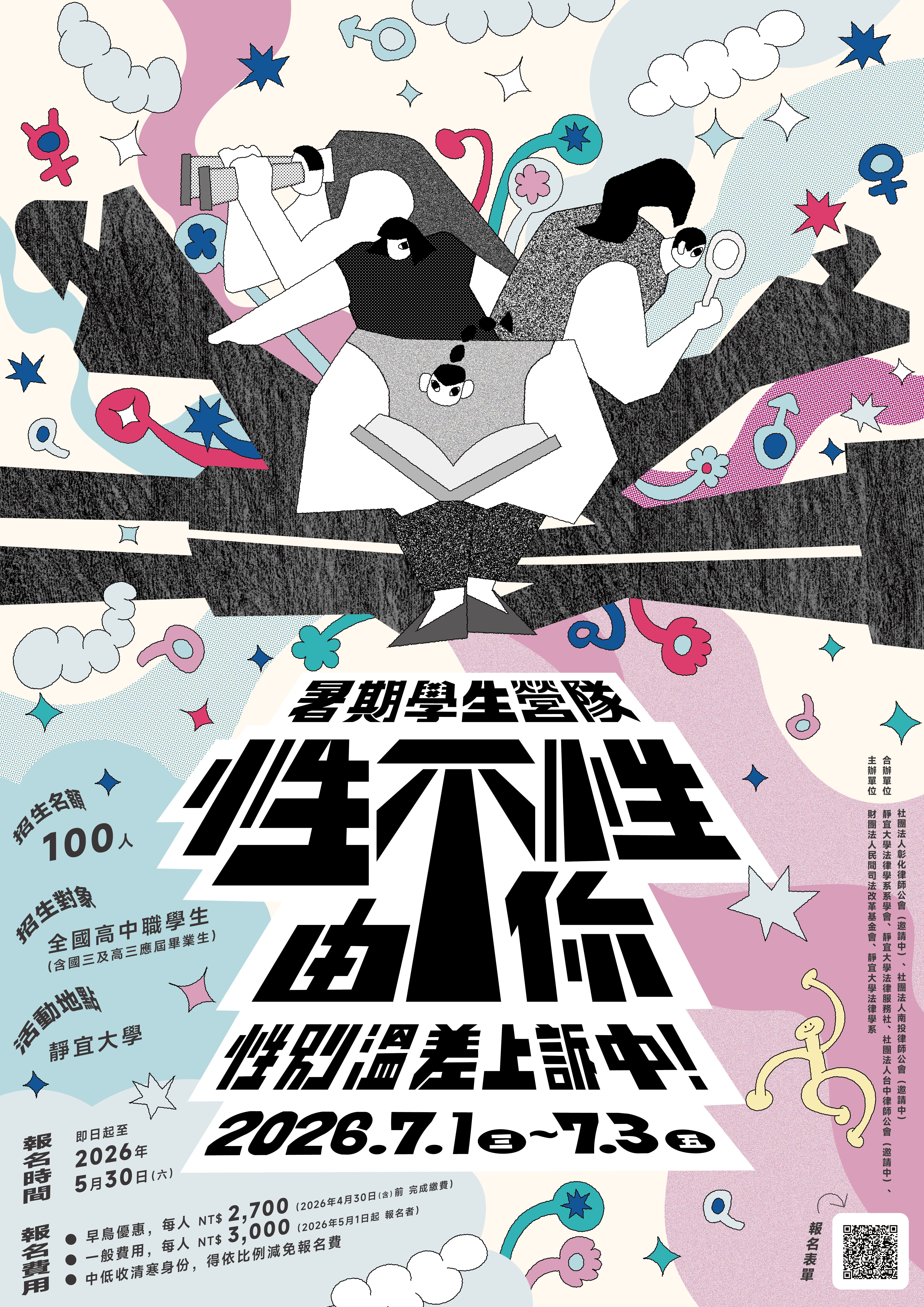 校園公告 公告主旨 轉知靜宜大學與司改會共同辦理暑期學生營隊【性不性由你—性別溫差上訴中!】 發佈日期 2026 年 4 月 17 日 發佈單位 生輔組 公告類別 最新消息, 學生園地 公告等級 轉知 點閱次數 68 公告內容 有興趣同學請自行報名參加。 相關附件 【2026-04-17】「歷史上的原住民族政策」系列講座 【2026-04-17】國立清華大學幼兒教育學系 「暑期營隊-總共104天的暑假幼到來」 ...