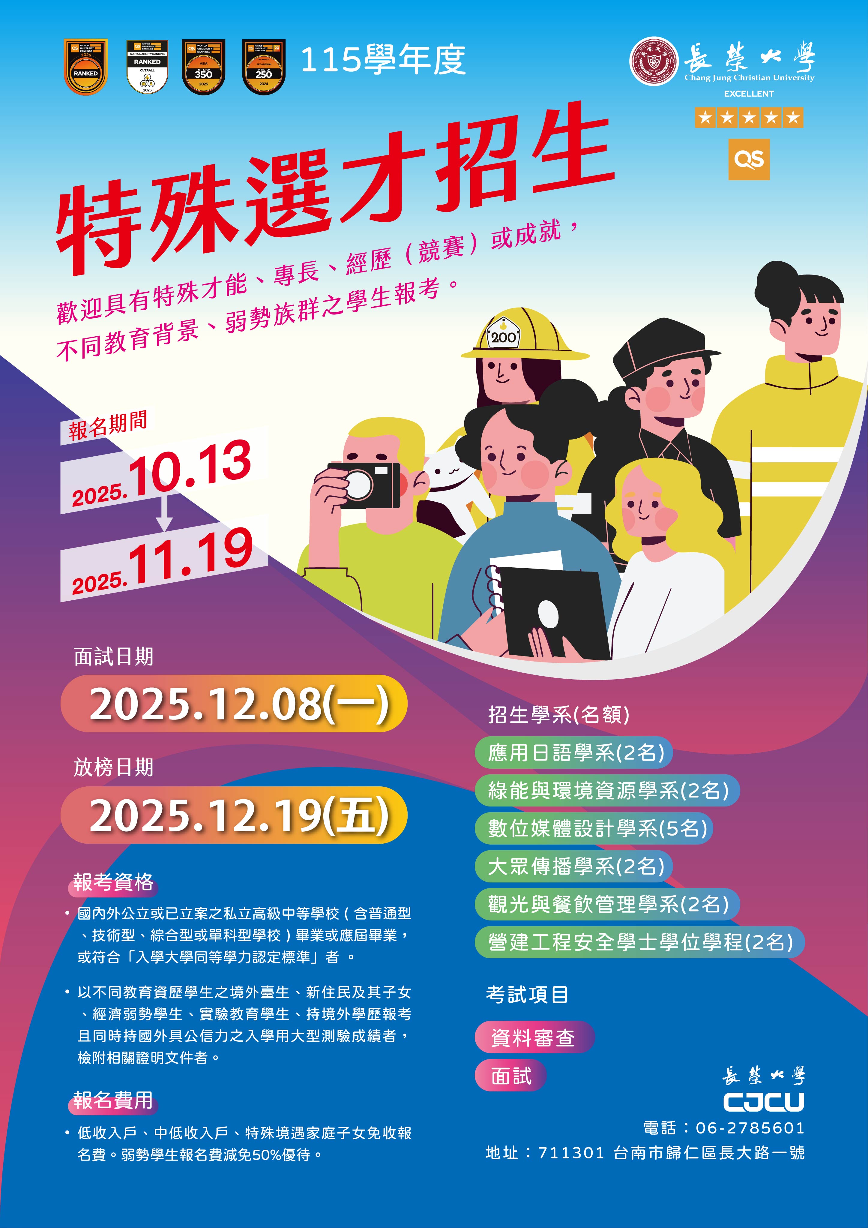 校園公告 公告主旨 長榮大學115學年度辦理特殊選才招生資訊 發佈日期 2025 年 10 月 03 日 發佈單位 輔導室 公告類別 最新消息 公告等級 轉知 點閱次數 12 公告內容 一、本校為鼓勵具特殊才能、專長、經歷(競賽)或成就,不同教育背景及弱勢族群之學生進入大學就讀,特辦理115學年度特殊選才招生。 二、特殊選才重要期程如下: (一)報名日期:2025年10月13日至11月19日 (二)面試日期:2025年12月8日(星期一) (三)放榜日期:2025年12月19日(星期五) 三、檢附招生簡章電子檔乙份,敬請參考。 相關附件 招生簡章海報 招生簡章海報 檔案名稱檔案大小檔案格式下載招生簡章海報.jpg919.68 KB新視窗開啟檔案 招生簡章海報.jpg 招生簡章電子檔 招生簡章電子檔 檔案名稱檔案大小檔案格式下載招生簡章電子檔.pdf1.77 MB新視窗開啟檔案 招生簡章電子檔.pdf 【2025-10-03】淡江大學於114年11月8日(星期六)辦理75週年校慶活動「尋找蛋捲 ... 【2025-10-03】亞洲大學115學年度學士班特殊選才招生資訊