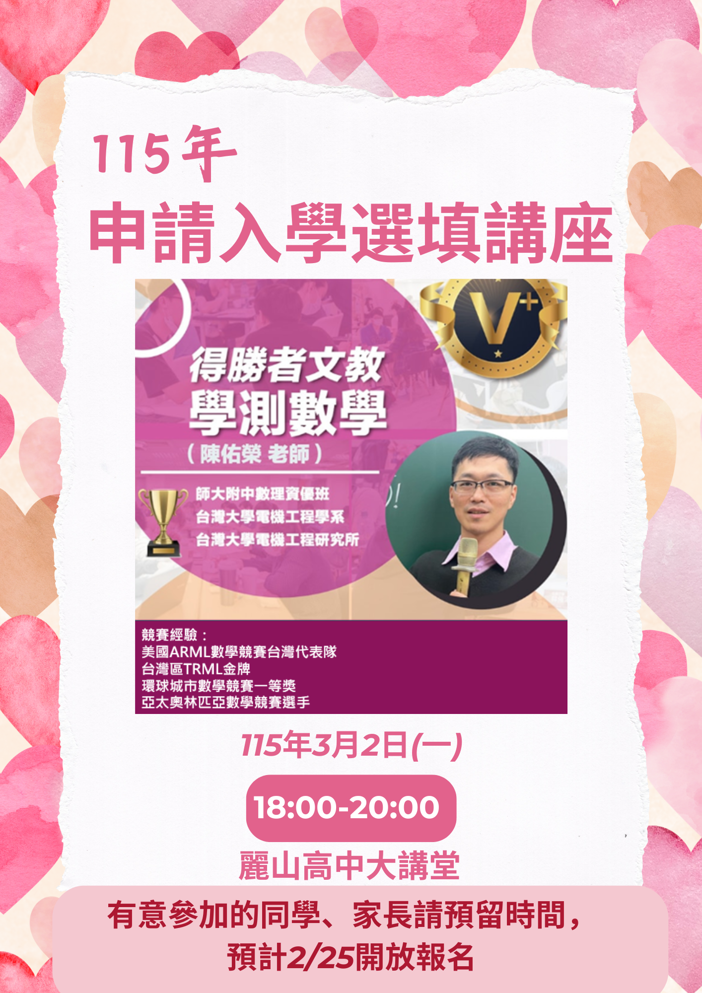 校園公告 公告主旨 115年申請入學選填講座 發佈日期 2026 年 2 月 10 日 發佈單位 輔導室 公告類別 最新消息 公告等級 轉知 點閱次數 122 公告內容 相關附件 115甄選入學講座 (1) 115甄選入學講座 (1) 檔案名稱檔案大小檔案格式下載115甄選入學講座 (1).png2.35 MB新視窗開啟檔案 115甄選入學講座 (1).png 【2026-02-10】輔仁大學推廣教育中心辦理114 學年度第二學期法律學系進修學士班 ... 【2026-02-10】【獲獎】賀!本校師生參加2026年臺灣國際科展表現優良