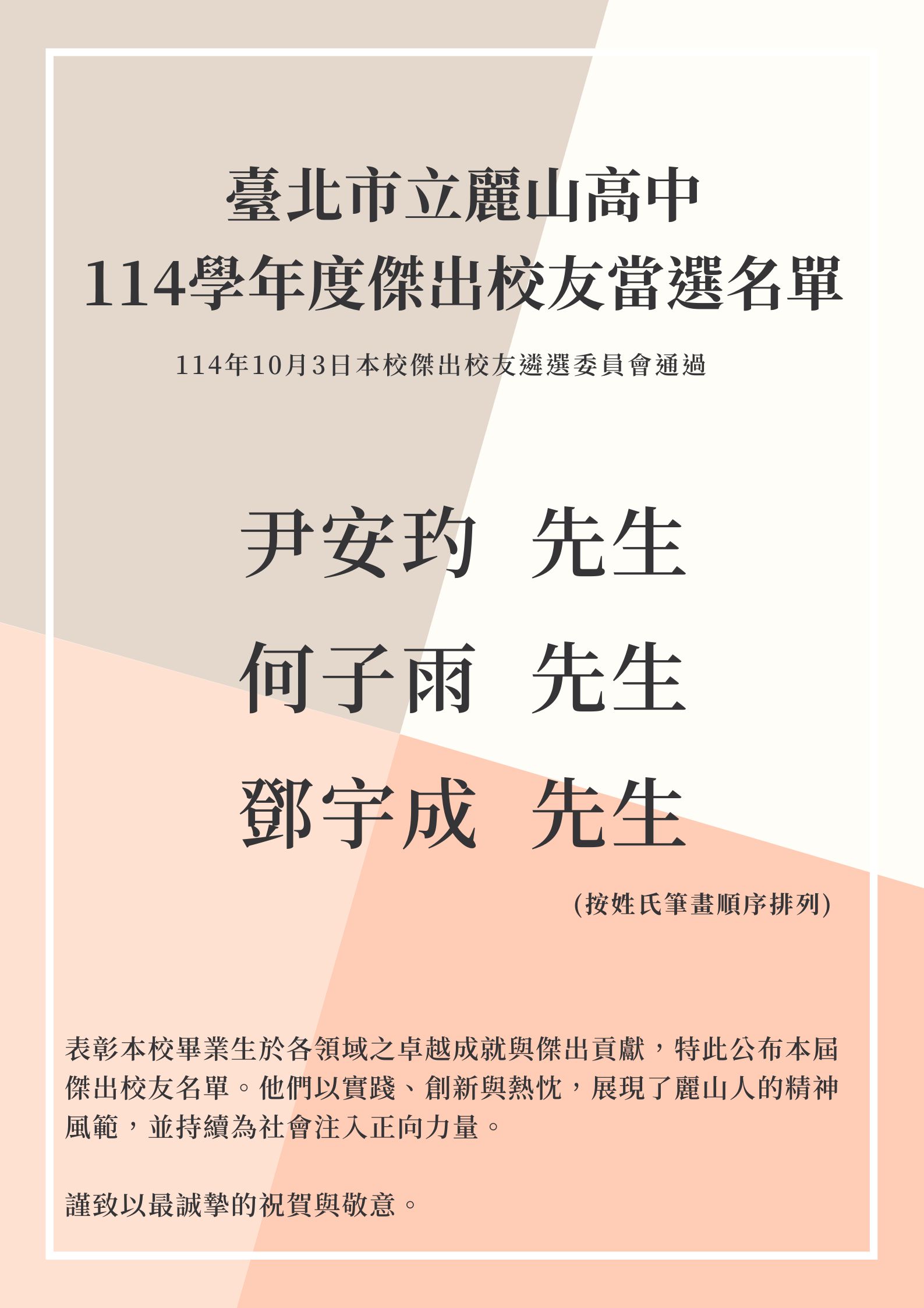 校園公告 公告主旨 臺北市立麗山高中114學年度傑出校友當選名單公告 發佈日期 2025 年 10 月 08 日 發佈單位 校長室 公告類別 最新消息, 麗山快訊, 重要消息 公告等級 重要 點閱次數 251 公告內容 相關附件 【2025-10-08】【停機公告】本市教網中心預計於10月8日(星期三)晚間7時至11時 ... 【2025-10-08】「SDGs × QGIS:地理資訊下的永續議題探究」講座